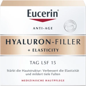 Eucerin HYALURON-FILLER + ELASTICITY Tagespflege beinhaltet darüber hinaus LSF 15 und einen UVA-Filter für zusätzlichen Schutz vor UV-Strahlung, welche vertiefen und lichtbedingte beschleunigen kann.