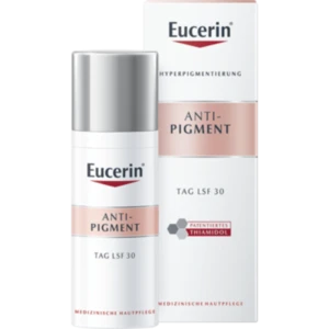 Die Eucerin Anti-Pigment Tagescreme LSF 30 enthält Thiamidol, einen effektiven und patentierten Pflegewirkstoff, der auf die Melaninproduktion an ihrem Ursprung einwirkt. Die Pflege lässt Pigmentflecken nach und nach verblassen und beugt ihrer Neuentstehung vor. Klinische und dermatologische Studien belegen die sehr gute Wirksamkeit und Hautverträglichkeit der leichten Tagescreme. Erste Ergebnisse sind bereits nach zwei Wochen sichtbar. Bei weiterhin regelmäßiger Anwendung verbessert sich der Hautton zusehends weiter.