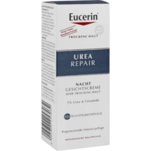 Eucerin UREA REPAIR Nacht Gesichtscreme 5% ist eine intensive Gesichtspflege für trockene bis sehr trockene und spannende Haut. Angereichert mit und , zwei natürlichen, feuchtigkeitsbindenden Präparaten versorgt die Creme sofort mit Feuchtigkeit und lindert das Spannungsgefühl. Eucerin UREA REPAIR Nacht Gesichtscreme 5% mildert jedoch nicht nur Rauigkeit, indem die Hautfeuchtigkeit bewahrt wird, sie glättet durch die keratolytische Wirkung des Wirkstoffs Urea auch die Haut. (Ursache für raue Haut ist häufig Feuchtigkeitsmangel.) Da die Creme Trockenheit, Spannungsgefühl und Rauigkeit verringert, ist sie zur Linderung der Symptome trockener Haut (zum Beispiel durch ) geeignet. Auch bei Altershaut.